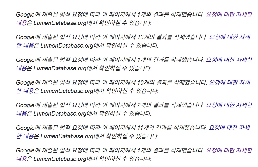 “Google에 제출된 법적 요청에 따라 이 페이지에서 X개의 결과를 삭제했습니다.” 와 같은 문구가 검색 결과 하단에 표시되고